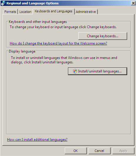 Ensuite, allez dans l’onglet « Keyboards and languages » et cliquez sur « Install/uninstall language » pour que l’on puisse charger le pack de langue.