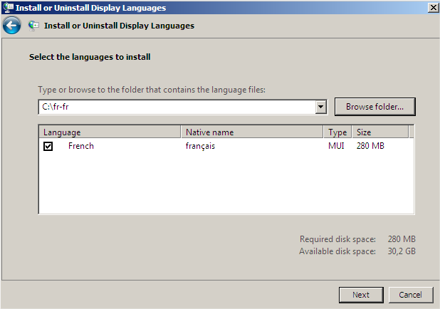 Cliquez sur « Browse folder » pour indiquer le chemin vers le répertoire contenant les fichiers de langue. Dans mon cas le répertoire s’appelle « fr-fr » et je l’ai copié à la racine de « C : ».
