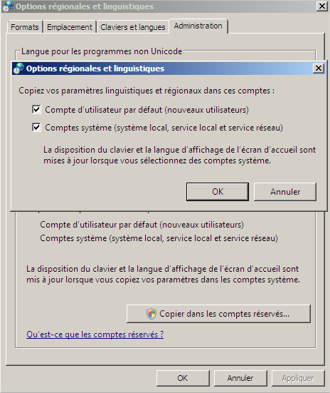 Pour finir, dans l’onglet « Administration » des « Options régionales et linguistiques », cliquez sur « Copier dans les comptes réservés ». Et, cochez les deux options comme je l’ai fais ci-dessous pour que la langue française soit appliquée sur les comptes systèmes et les comptes d’utilisateurs qui seront créés à l’avenir.