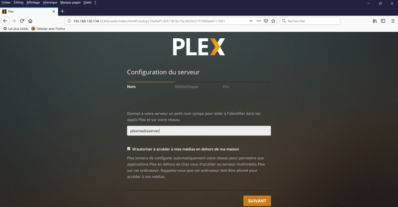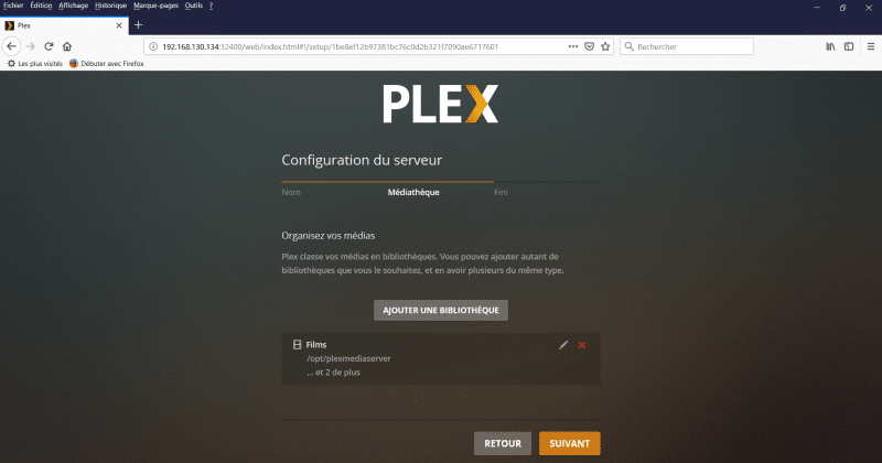 Maintenant qu'il y a au minimum une bibliothèque ajoutée à notre serveur Plex, on peut cliquer sur "Suivant".