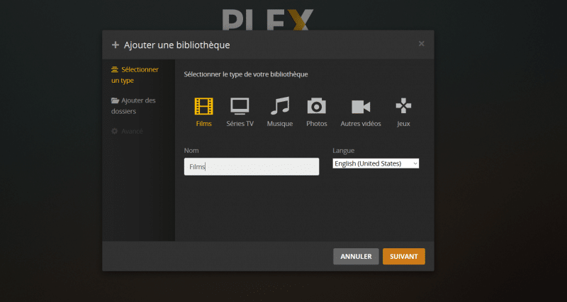 Patientez quelques secondes, le temps que Plex d'initialise, cliquez ensuite sur "Ajouter une bibliothèque". Prenez le type "Films" et spécifiez un nom pour cette bibliothèque, on peut tout simplement indiquer "Films".