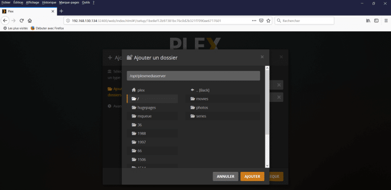La commande précédente va créer les dossiers "movies", "series" et "photos" dans le répertoire "/opt/plexmediaserver/".
