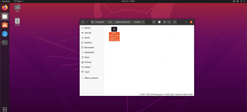 Avant de continuer, en guise d'exemple, je vais déposer un reportage, afin que par la suite, je puisse le streamer depuis mon navigateur. Le dossier cible est /opt/plexmediaserver/movies que nous avons créée en amont.