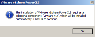 Une fois le téléchargement terminé, exécutez le fichier téléchargé pour démarrer l'installation. On vous averti que VMware vSphere PowerCLI requiert un composant additionnel nommé "VMware VIX". Il sera installé automatiquement.