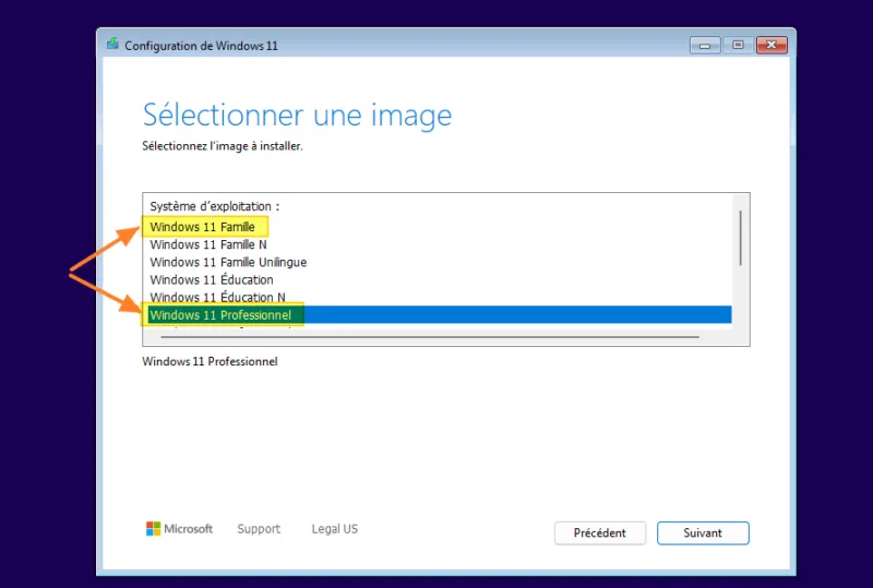 Par la suite, sélectionnez l'image que vous souhaitez installer, c'est-à-dire l'édition de Windows 11. Ceci dépend en fait de la licence dont vous disposez, mais aussi du contexte d'installation (à la maison, en entreprise, etc.). Peu importe l'édition, il y a une solution pour effectuer une installation sans compte Microsoft.