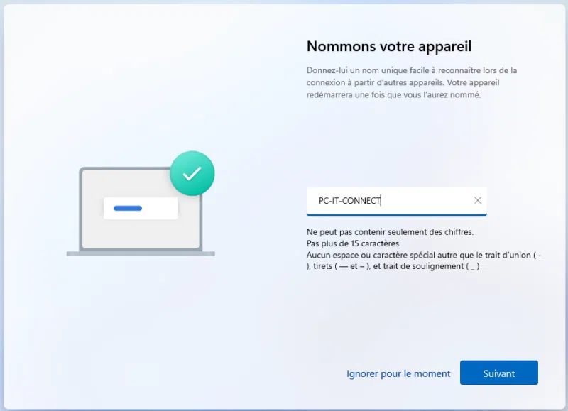 D'abord, commencez par nommer votre futur appareil Windows 11.