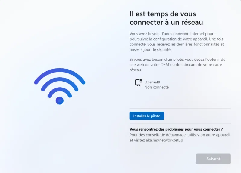 - Si vous envisagez d'installer Windows 11 Pro, la machine peut être connectée au réseau (mais ce n'est pas obligatoire). Ceci n'empêchera pas d'utiliser un compte local.