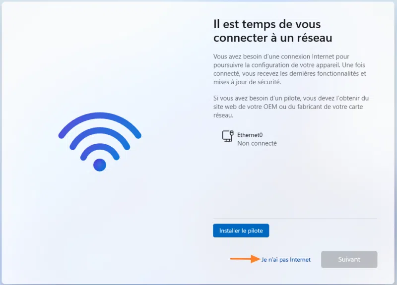 Une fois que la machine aura redémarré, vous pourrez retourner jusqu'à la même étape où l'assistant évoque un problème de réseau. Néanmoins, cette fois-ci, un bouton supplémentaire est disponible : "Je n'ai pas Internet". Cliquez dessus.