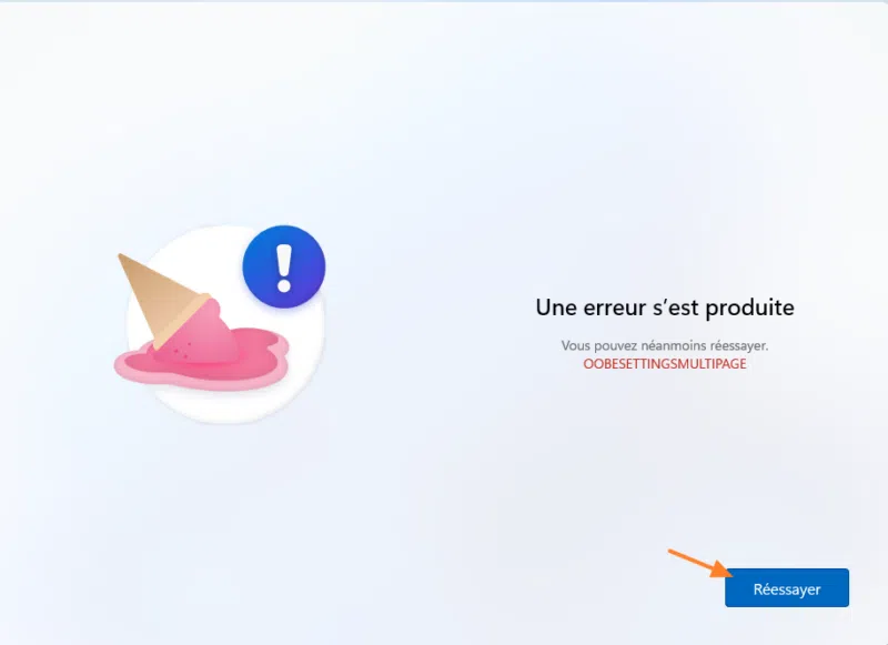 Une fenêtre dissuasive avec l'erreur "OOBESETTINGSMULTIPAGE" va s'afficher à l'écran. Pas de panique, cliquez simplement sur le bouton "Réessayer" et vous allez pouvoir passer à la suite de l'installation.