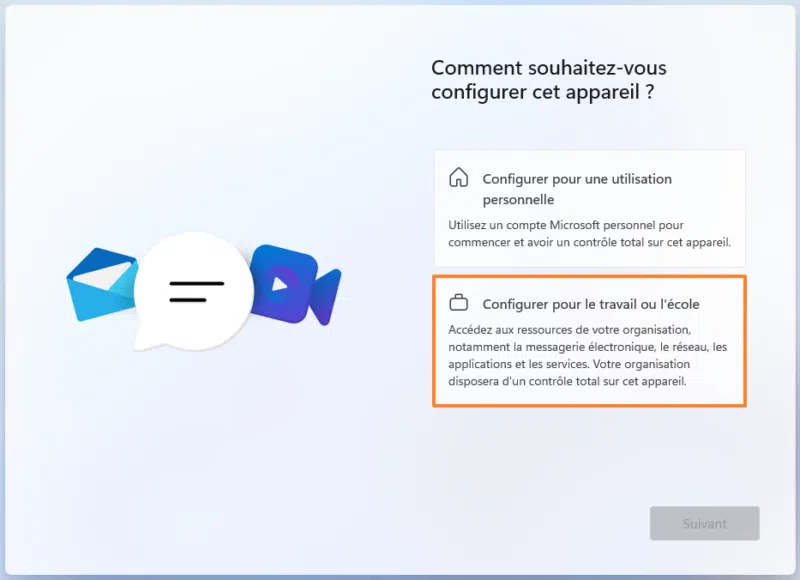 Lors de l'installation de Windows 11 Pro, il y a une étape nommée "Comment souhaitez-vous configurer cet appareil ?". Si vous souhaitez installer Windows 11 avec un compte local, choisissez impérativement "Configurer pour le travail ou l'école", même si c'est pour une utilisation personnelle.