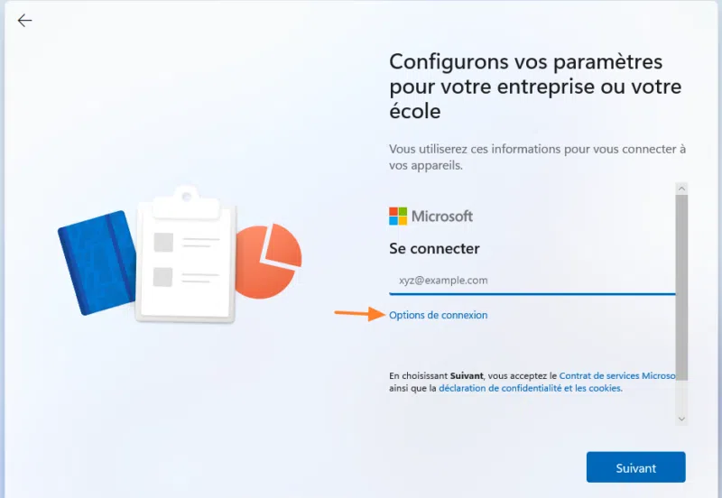 L'assistant vous demande alors un compte Microsoft. Cliquez sur "Options de connexion" puis continuez.