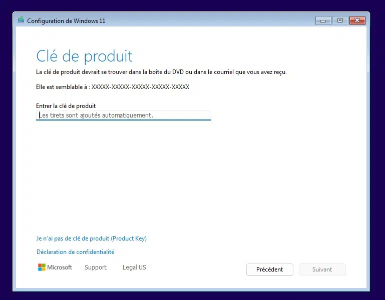 Ensuite, vous devez spécifier la clé de licence pour activer votre installation de Windows 11. Si vous n'en avez pas pour le moment ou que vous souhaitez le faire plus tard, cliquez sur "Je n'ai pas de clé de produit".