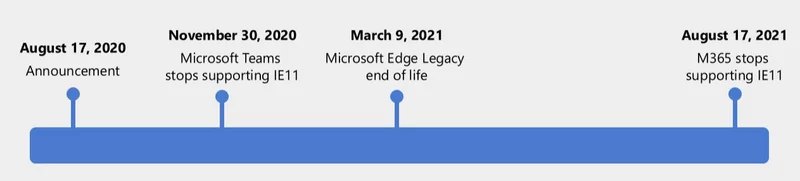 La dernière version en date d'Internet Explorer, à savoir Internet Explorer 11, ne sera plus compatible avec les applications Microsoft 365, dont Teams, OneDrive, Outlook mais aussi toute la partie Office 365. Néanmoins, Teams aura le droit à un peu de temps supplémentaire puisqu'il fonctionnera dans IE 11 jusqu'au 30 novembre 2021. Le choix de Microsoft peut se comprendre car Internet Explorer 11 est sorti en 2013, et depuis il faut dire que les standards du Web ont évolués.