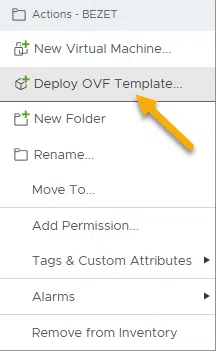 Aujourd’hui, nous allons déployer l’OVA dans un environnement VMware vSphere. Dans votre environnement vSphere, réalisez un clic droit sur un dossier dans la vue inventaire et sélectionnez « Deploy OVF Template ».