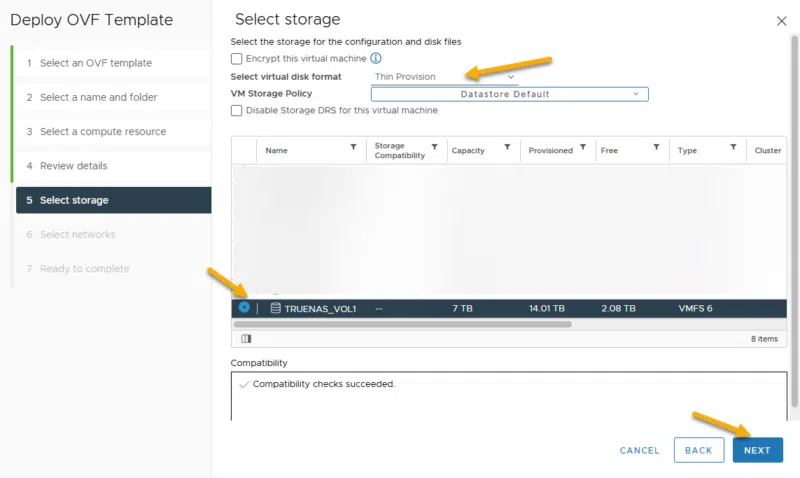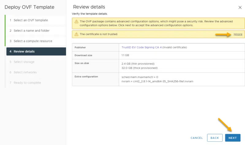 Ici, nous devons dans un premier temps cliquer sur « Ignore » pour accepter le certificat, car il n’est pas reconnu comme digne de confiance. Puis, cliquez sur suivant pour sélectionner le stockage ainsi que les réseaux.