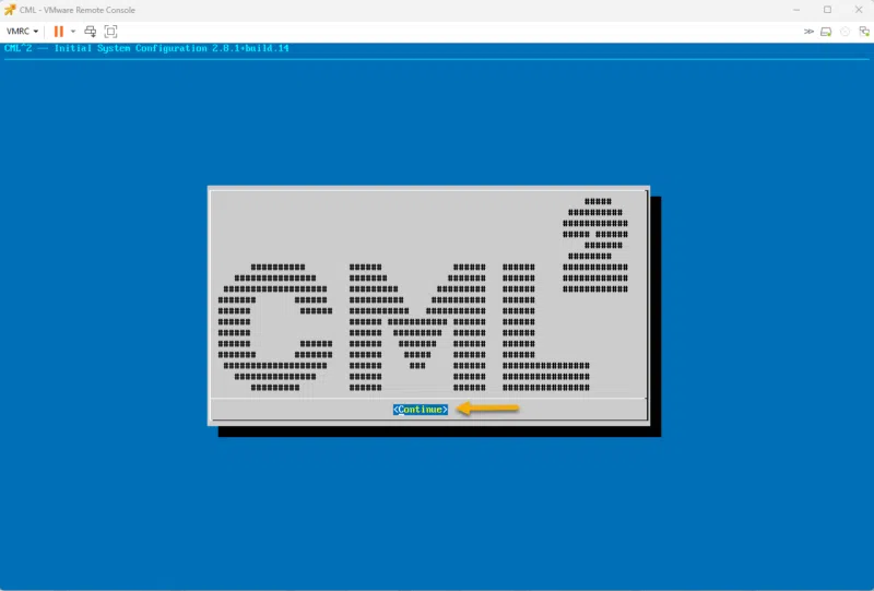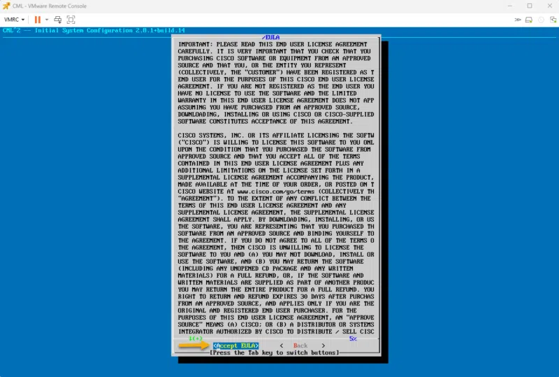 Une fois la VM démarrée, nous devons configurer le déploiement, les différents comptes ainsi que l’ajout des images des équipements réseaux fournis avec CML.