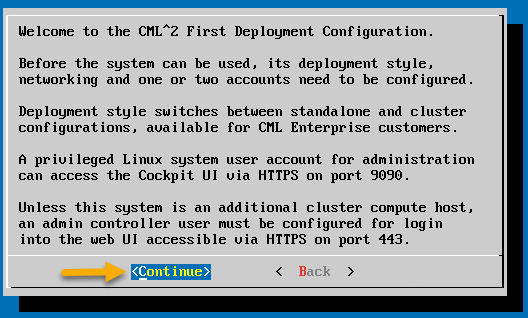 Une fois la licence acceptée, nous devons choisir le type de déploiement en mode simple hôte ou en mode Cluster, mais ce dernier n’est disponible que pour la version Entreprise de CML. Dans les étapes qui suivent, nous allons aussi créer deux comptes utilisateur. Validez sur l’option « Continue ».
