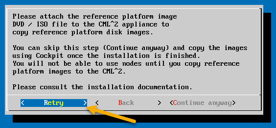 Un message d’avertissement apparait ! Nous devons configurer notre VM avec l’image ISO « refplat-20241016-freetier.iso », à configurer dans le lecteur DVD virtuel de la VM. Cette image ISO contient les définitions des équipements CISCO. Quand c’est fait, validez sur « Retry ».