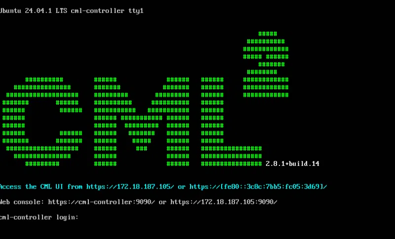 Une fois l’installation terminée, nous avons cet écran avec l’adresse IP de gestion de la VM CML.