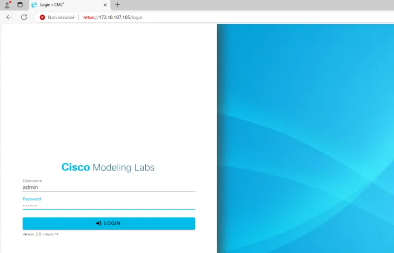 Pour vous connecter à l’interface d’utilisation CML vous devez vous connecter à l’aide de votre navigateur à l’adresse suivante : https://<adresse IP du serveur CML>