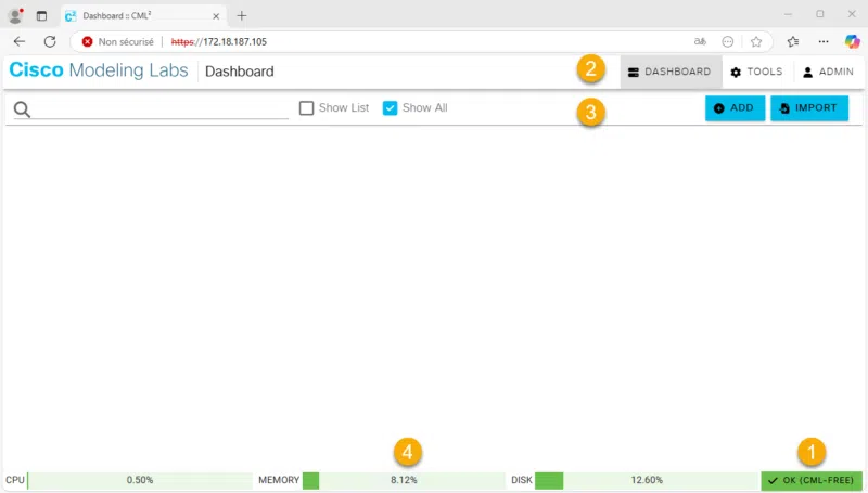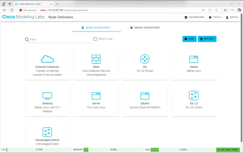 CML peut être installé sur un serveur bare-metal ou en tant que machine virtuelle sur un hyperviseur. Si vous prévoyez de simuler un grand nombre de nœuds, il est conseillé d’opter pour une machine avec au moins 64 Go de RAM et un processeur puissant.