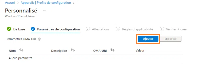 Sélectionnez la plateforme « Windows 10 et ultérieur », puis le type de profil « Modèles », et sélectionnez ensuite « Personnalisé » (vous pouvez faire une recherche pour gagner du temps).