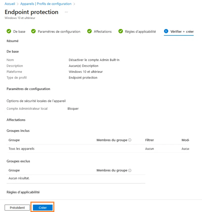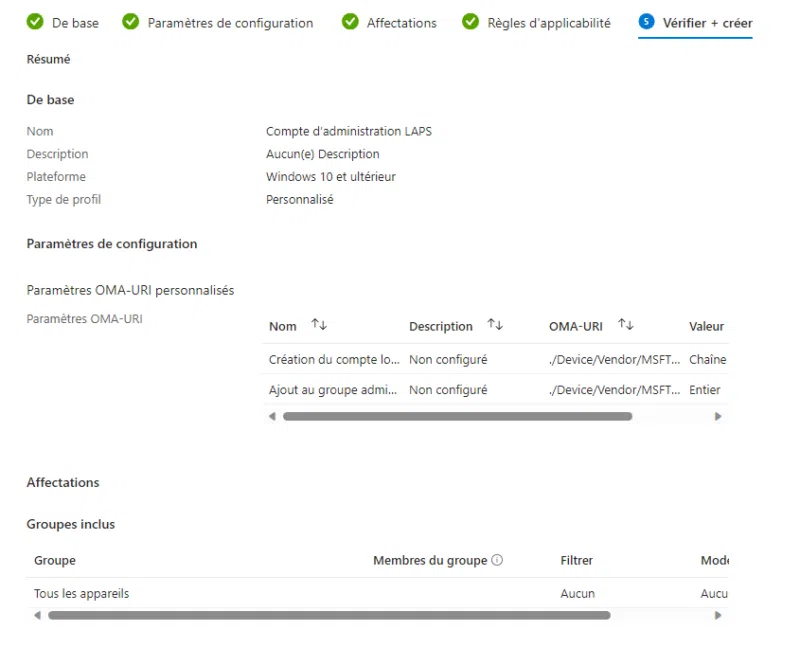 Cliquez ensuite sur « Créer » pour valider la création de notre stratégie, et mettre en place le déploiement uniforme de notre compte administrateur local.