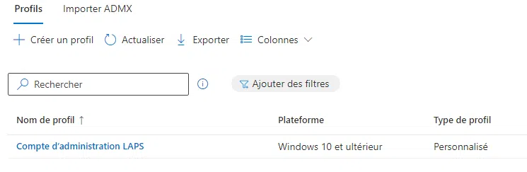 On retrouve ensuite notre stratégie sur l’écran qui liste les profils de configuration (stratégies) de Intune.