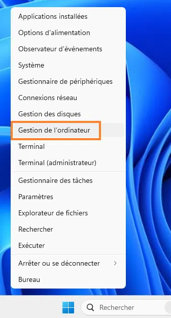 Pour cela, effectuez un clic droit sur le menu démarrer, puis cliquez sur "Gestion de l'ordinateur".