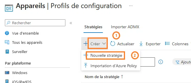 Dans le panneau de droite, cliquez ensuite sur "Créer" puis "Nouvelle stratégie" (anciennement, ce bouton s'appelait « Créer un profil »).