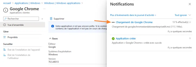 Lorsque vous finalisez la création de l'application, le package MSI est chargé sur Microsoft Intune. Ceci peut prendre un peu de temps en fonction de votre débit et de la taille du package.
