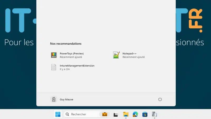 Après avoir synchronisé un appareil et avoir fait preuve de patience, l'application "PowerToys (Preview)" est bien déployée sur un appareil Windows 11 membre du groupe "PC_Corporate". Elle est visible dans le menu Démarrer de la session de l'utilisateur :