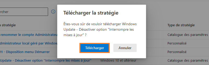 Un pop-up nommé "Télécharger la stratégie" apparaît l'écran. Cliquez sur "Télécharger" pour valider.
