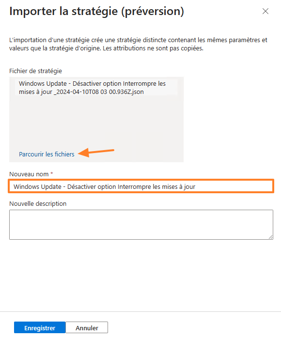 Vous devez également nommer la stratégie en remplissant le champ "Nouveau nom" et associer une description. Puis, cliquez sur le bouton "Enregistrer".