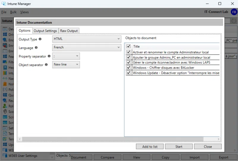 Terminons par la cerise sur le gâteau : la possibilité de générer une documentation de votre configuration ! Pour cela, vous pouvez utiliser le bouton "Document" présent dans chaque section d'Intune Manager, ou utiliser le menu "Bulk" puis "Document Types".