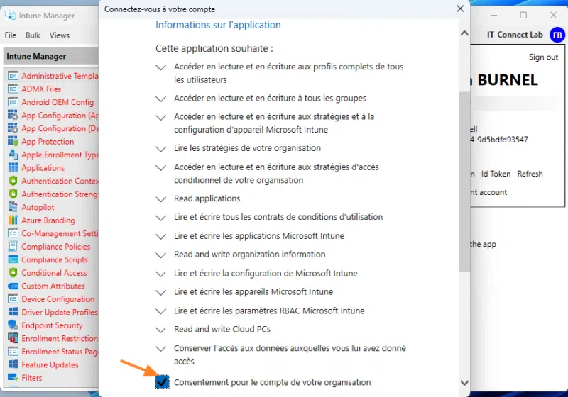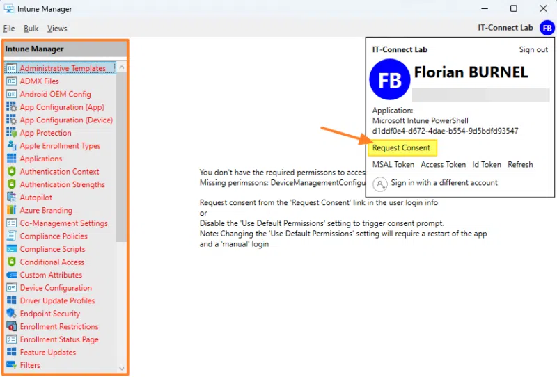 Ensuite, vous devrez valider l'accès pour que cette application ait les permissions suffisantes pour récupérer les données de configuration Intune de votre tenant. Depuis la version 3.9.6, l'outil s'appuie sur Microsoft Graph pour se connecter aux services Microsoft.