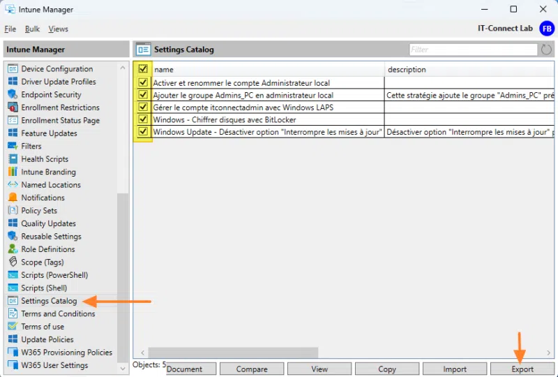 Si vous souhaitez simplement exporter et importer des stratégies Intune de type "Catalogue des paramètres", vous pouvez lire ce tutoriel :