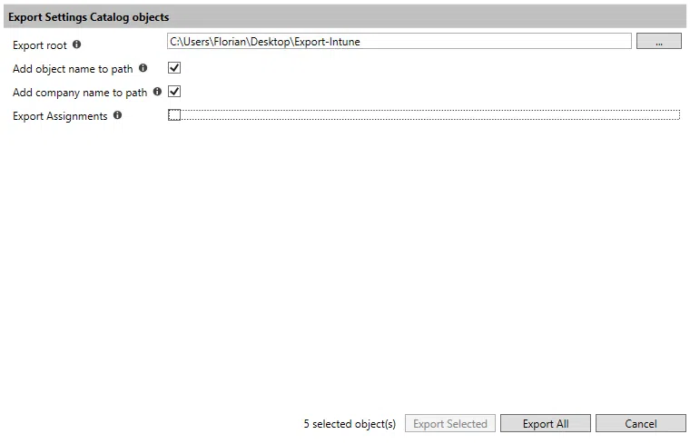 Ensuite, nous devons choisir le répertoire dans lequel effectuer l'export, et se chargera de l'alimenter. L'option "Add company name to path" permet de créer un dossier avec le nom de l'entreprise (définie sur le tenant) afin de stocker les données exportées. Nous avons aussi la possibilité d'exporter les affectations, contrairement à ce que propose l'outil d'export de Microsoft intégré à Intune, via l'option "Export Assignments".