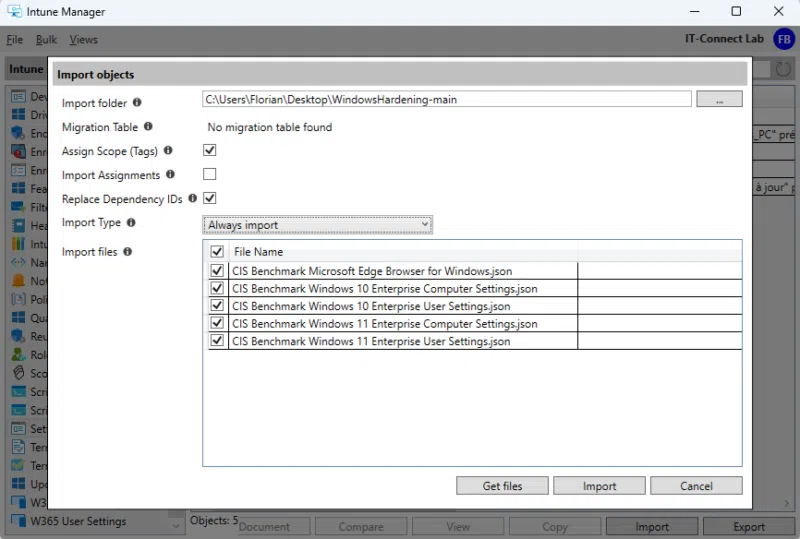 L'application Intune Manager est capable aussi d'importer des configurations sur votre environnement Intune. Pour explorer cette fonctionnalité, nous allons importer des stratégies Intune qui correspondent aux bonnes pratiques de configuration de Windows issues des guides CIS Benchmark.