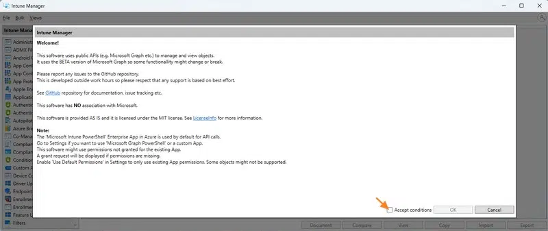 L'outil va se charger et ouvrir une interface graphique intitulée "Intune Manager". Commencez par accepter les conditions d'utilisation en cochant la case "Accept conditions", puis validez.