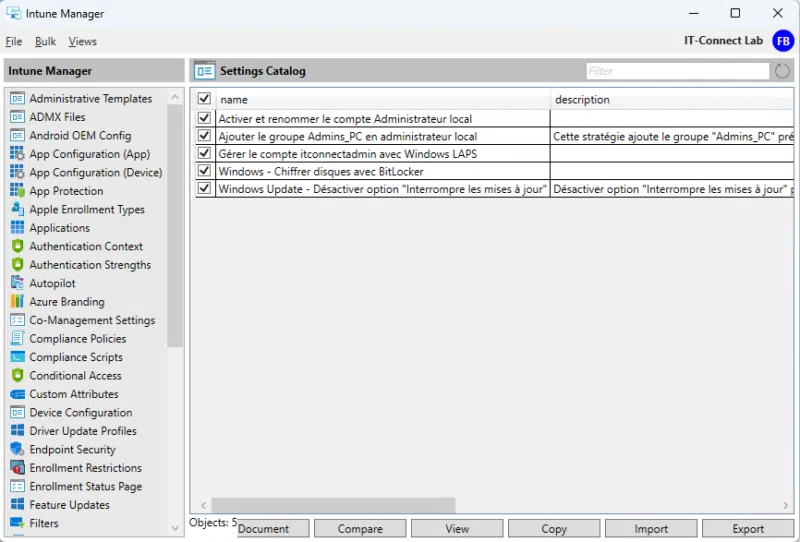 Il s'agit de stratégies de type "Catalogue des paramètres", donc nous pourrions les importer via le portail Intune. Néanmoins, Intune Manager va nous permettre un import en masse.