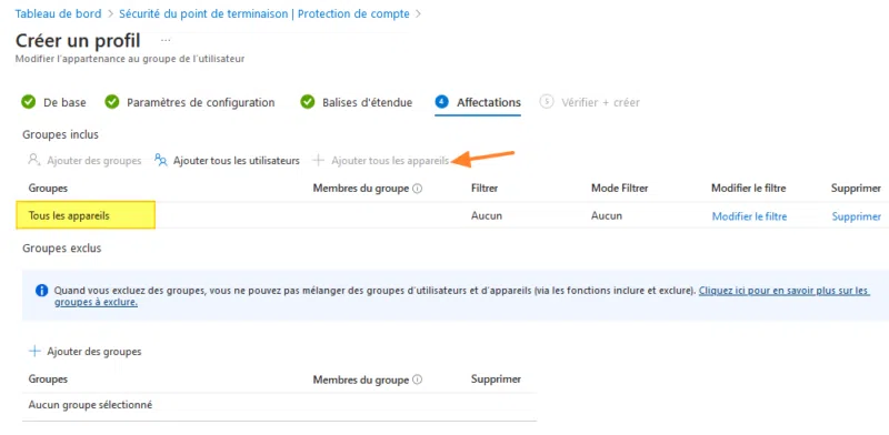 Vous devez choisir à quels appareils affecter cette stratégie, en fonction de vos besoins. Sélectionnez un ou plusieurs groupes d'appareils, ou utilisez l'option "Ajouter tous les appareils".