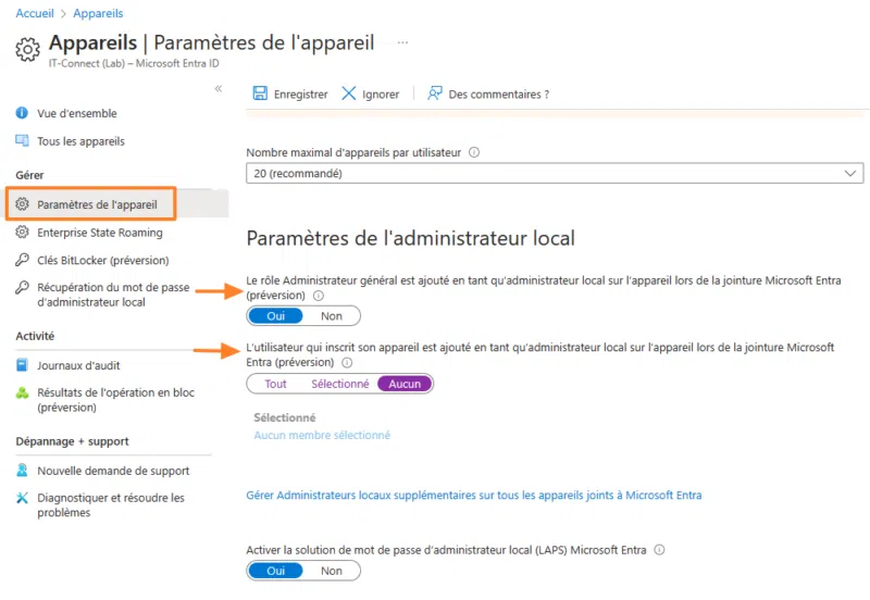 Récemment, Microsoft a introduit deux nouveaux paramètres dans la section "Paramètres de l'appareil" accessible via le portail Microsoft Entra puis "Appareils".
