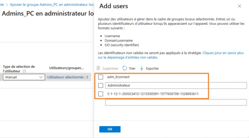 Remarque : si vous avez besoin de gérer le groupe "Administrateurs" local de machines jointes dans Entra ID (Azure AD) mais aussi pour des machines "hybrides", vous devez configurer deux stratégies distinctes. Ceci permettra d'éviter certaines erreurs d'application de la stratégie.