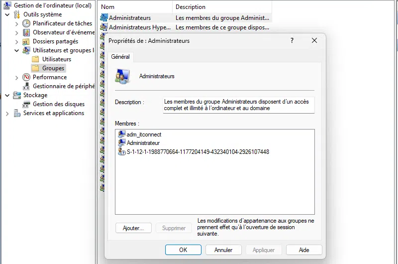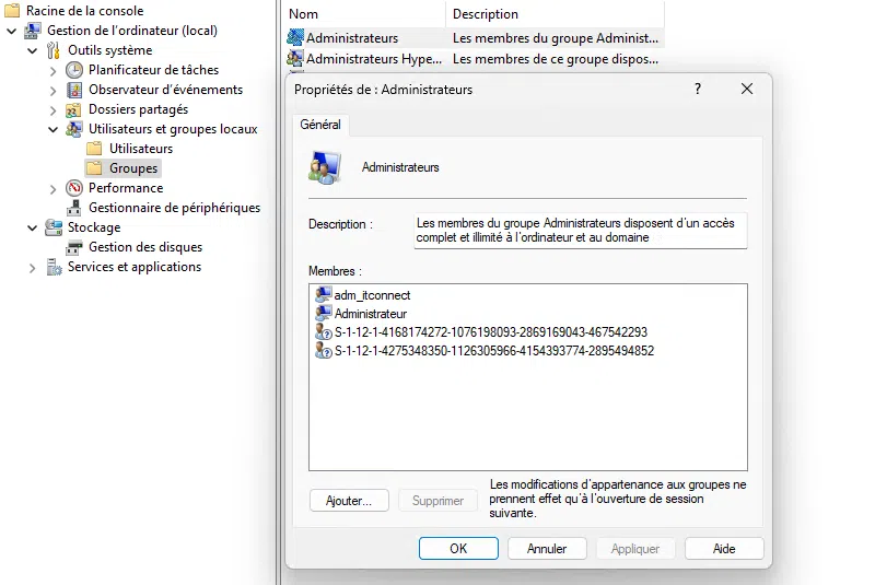 Ici, nous remarquons plusieurs valeurs, notamment deux comptes locaux : "adm_itconnect" et "Administrateurs". En plus, nous avons un SID qui est présent et la traduction avec le nom n'est pas effectuée. Toutefois, il faut savoir que tout SID que vous voyez dans le groupe "Administrateurs" commençant par "S-1-12-1" correspond à un groupe Entra ID (Azure AD).