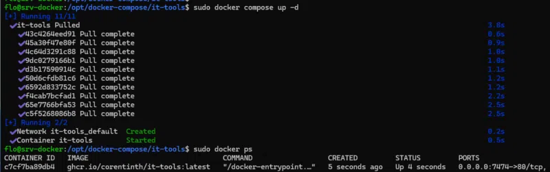 Quand c'est fait, il ne vous reste plus qu'à lancer la création du conteneur IT-Tools. Voici la commande à exécuter en étant positionné dans le répertoire où se situe le fichier Docker Compose :