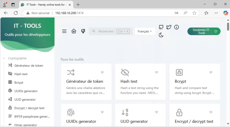 À partir d'un navigateur, vous pouvez accéder à l'interface d'IT-Tools : http://<IP de votre machine Docker>:7474.
