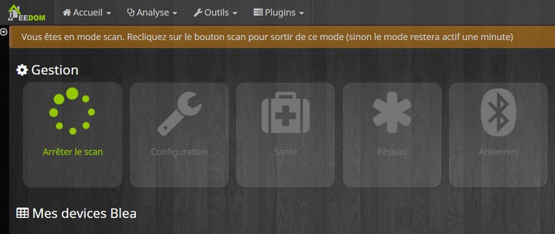 Il faut passer le plug-in en mode scan, pour cela accéder à la page du plug-in BLEA dans Jeedom et démarrez le scan.