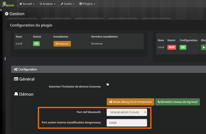 Descendez dans la page de gestion du plugin, dans la zone "Configuration" > "Démon" et sélectionnez votre clé Bluetooth dans la liste. Il peut s'agir d'une puce interne à votre Box domotique ou d'une clé Bluetooth connectée en USB.