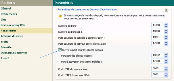 Dans sa configuration par défaut, le serveur d’administration n’ouvre pas les ports pour les clients mobiles, qui sont au nombre de deux : « 13 292 » pour la connexion client/serveur notamment pour la synchronisation et « 17 100 » pour l’activation des clients mobiles.